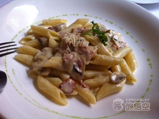 メインは夜のメニューにもある、ペンネ・カルボナーラを。